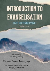 On Thursday 26th September 2024, Fr. Philip Kemmy will deliver a talk on ‘Introduction to Evangelisation’ aimed particularly at parish pastoral councils and those involved in parish ministry.